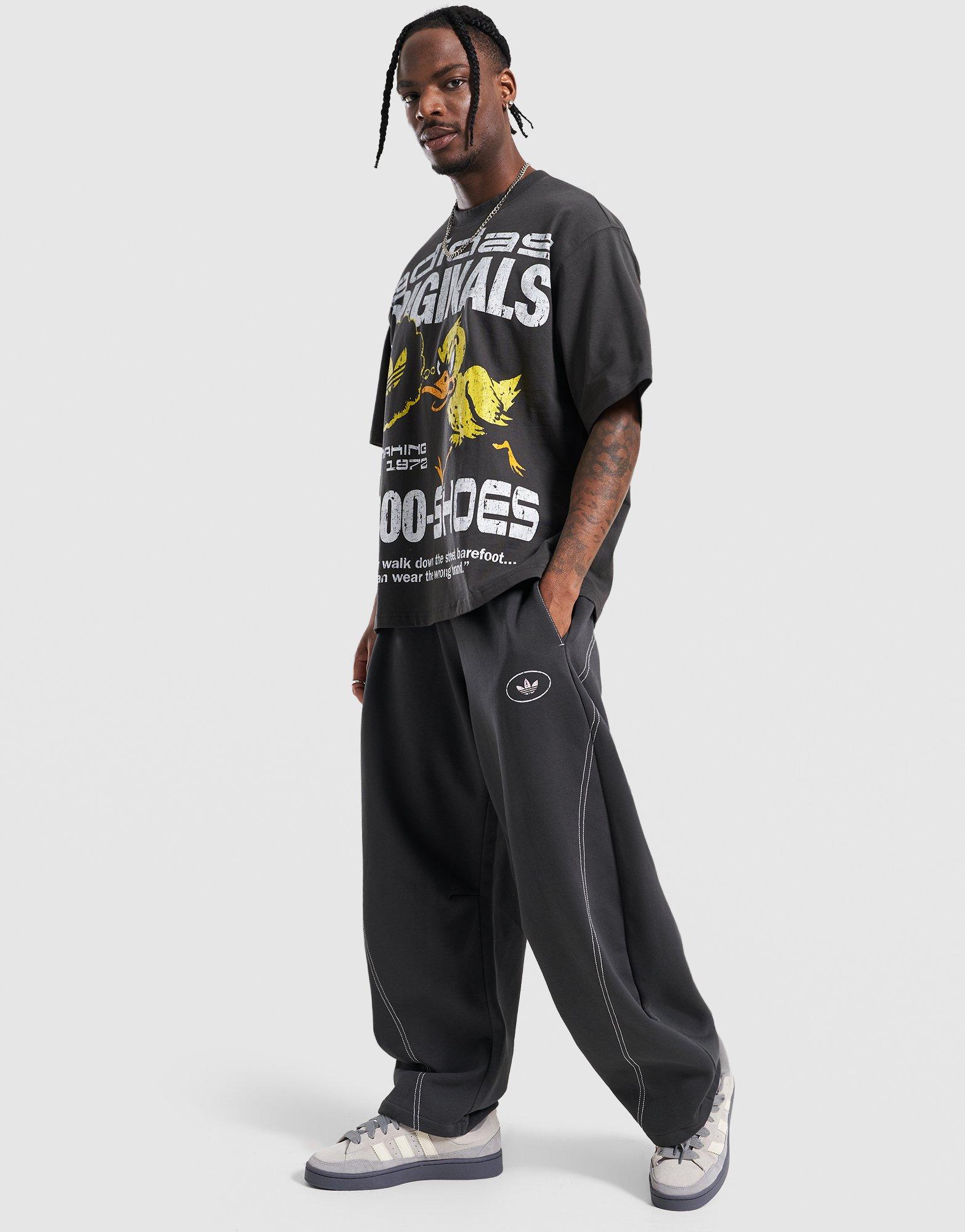 Spodnie adidas Originals Shoemaker Fleece Sweat to propozycja dla osób ceniących oryginalność w codziennych stylizacjach. Luźny krój typu baggy nawiązuje do klasyki streetwearu, oferując pełną swobodę ruchów i nowoczesny wygląd. Głęboka czerń materiału stanowi doskonałe tło dla wyrazistych, białych szwów oraz charakterystycznego logo Trefoil umieszczonego w owalu.