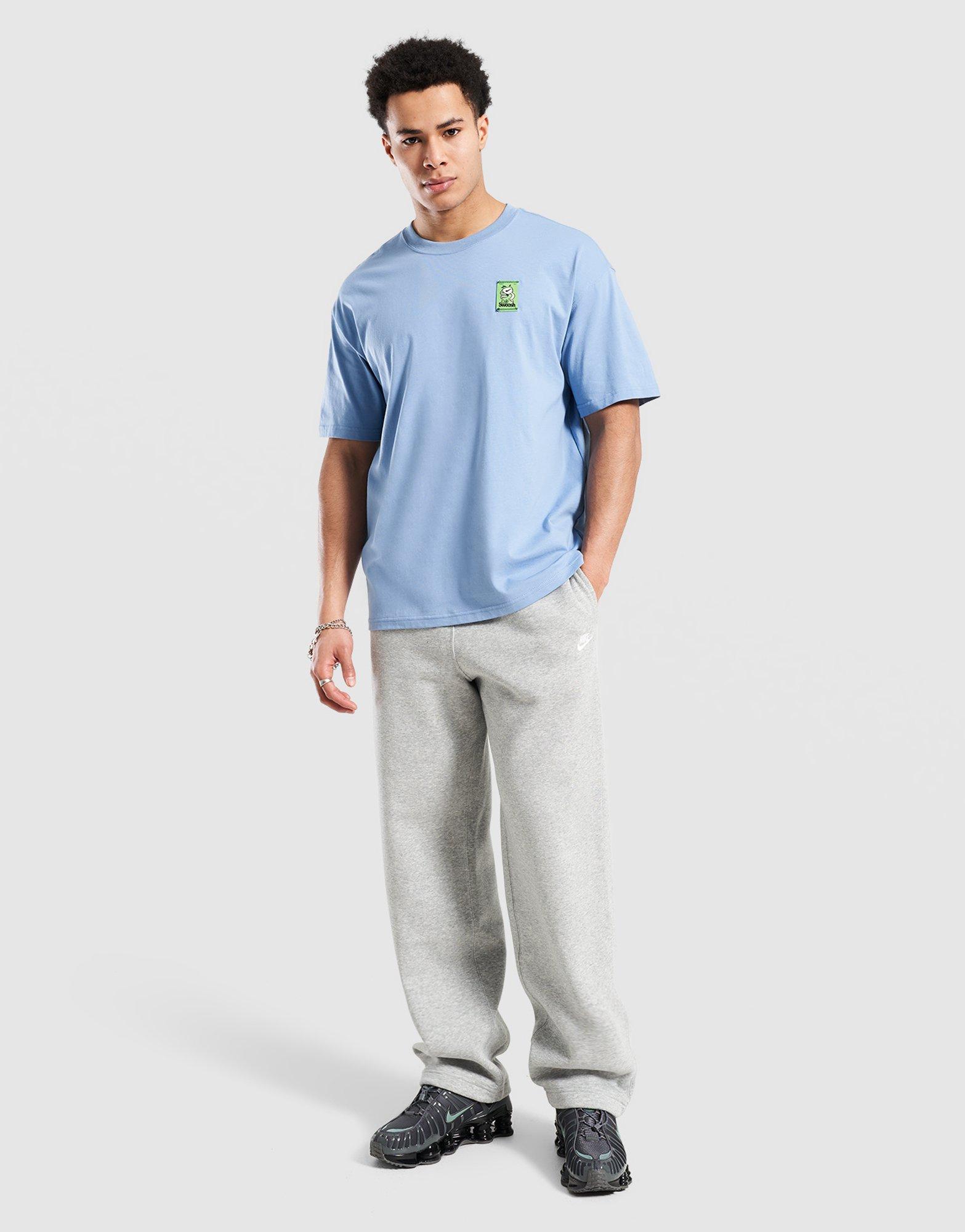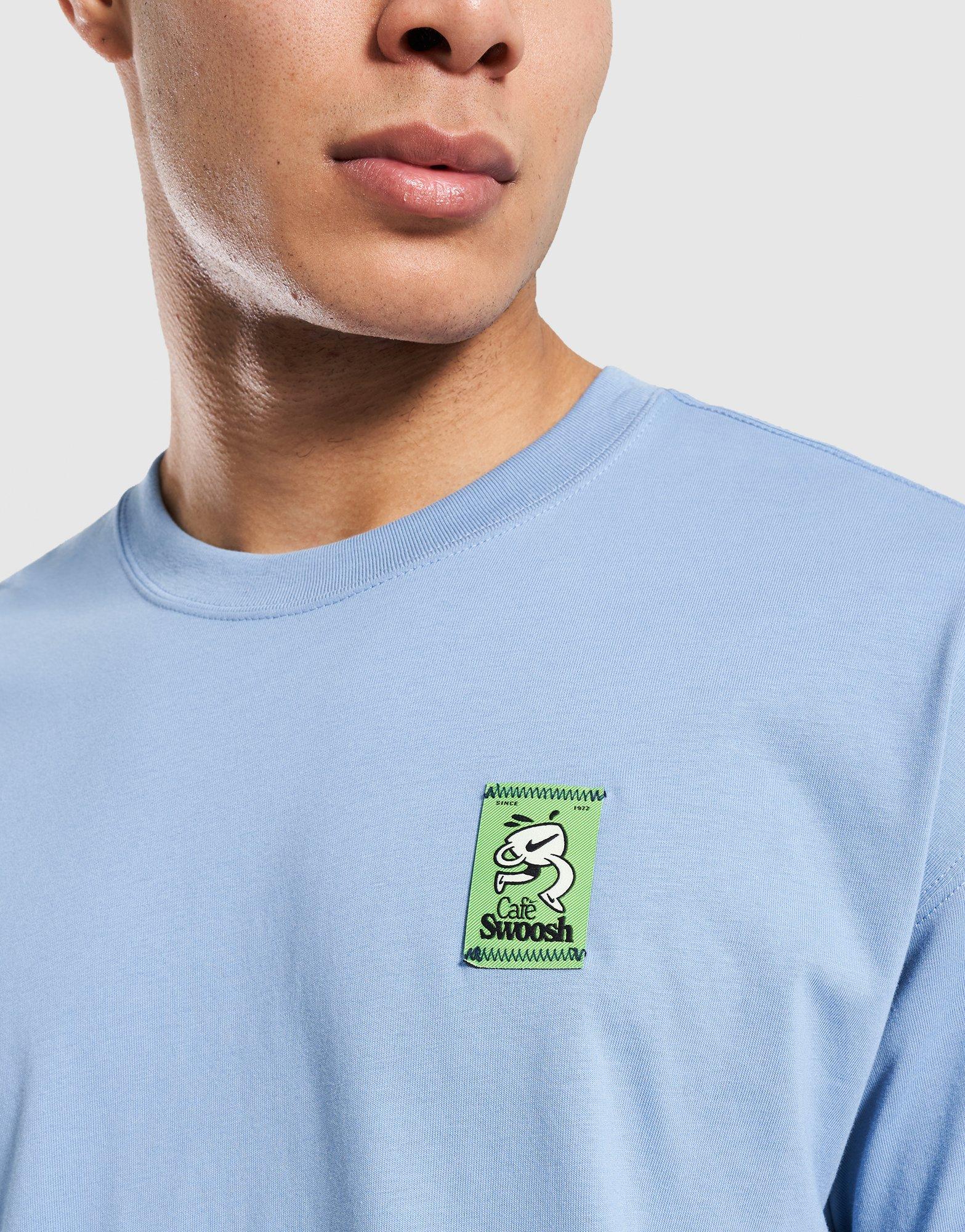 Niebieski t-shirt Nike o luźnym kroju to idealna baza do codziennych, miejskich stylizacji. Wykonany z wysokiej jakości miękkiej bawełny zapewnia maksymalny komfort noszenia przez cały dzień. Model wyróżnia się unikalną grafiką Cafe Swoosh, która nadaje całości nowoczesnego, streetwearowego charakteru.
