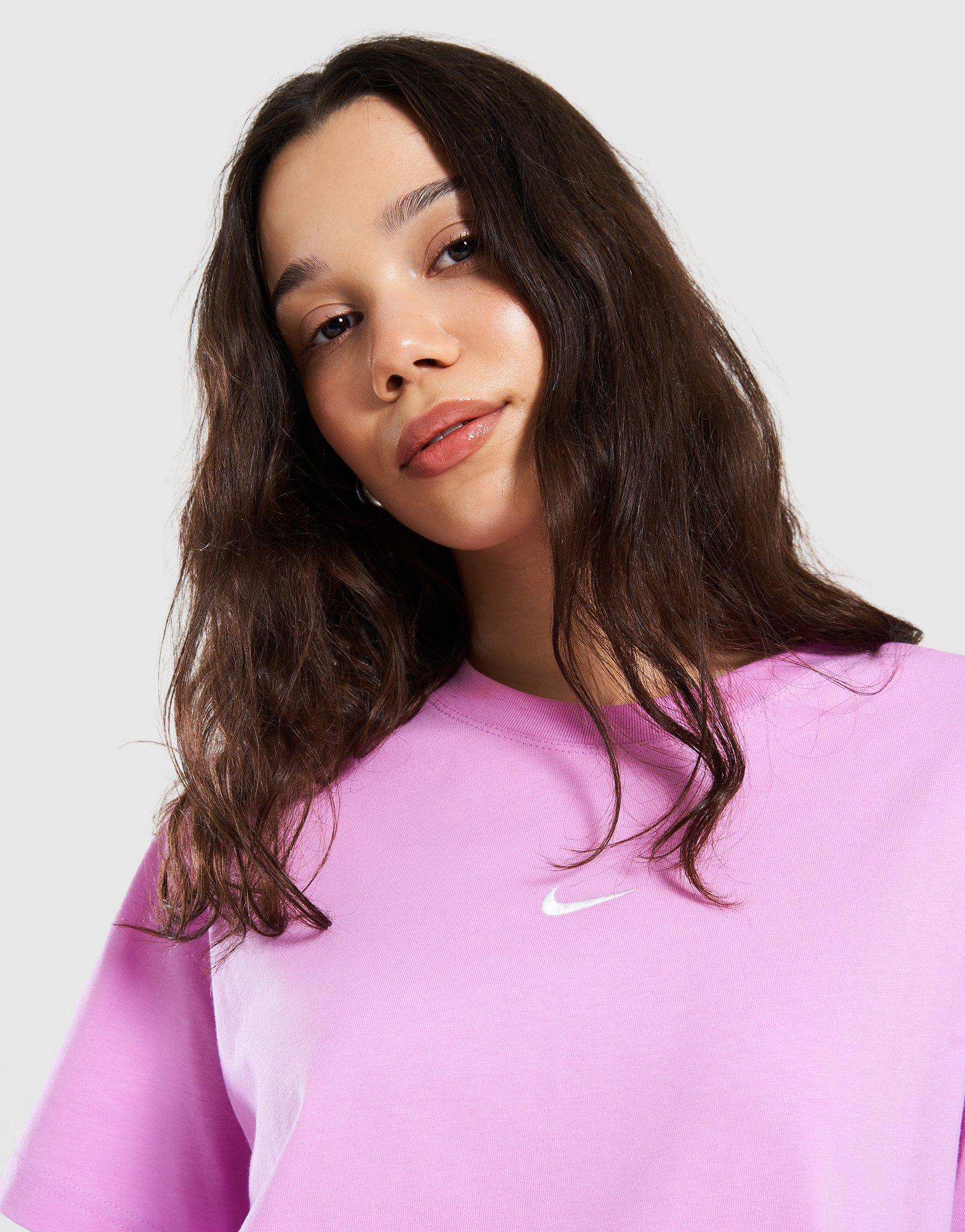 T-shirt świetnie prezentuje się w zestawieniu z jasnymi spodniami dresowymi lub klasycznym denimem, tworząc nowoczesny look. Jest to idealny wybór dla kobiet ceniących markę Nike za połączenie funkcjonalności z estetyką. Aby zachować intensywność różowego koloru, zaleca się pranie w niskich temperaturach zgodnie z instrukcją na metce.