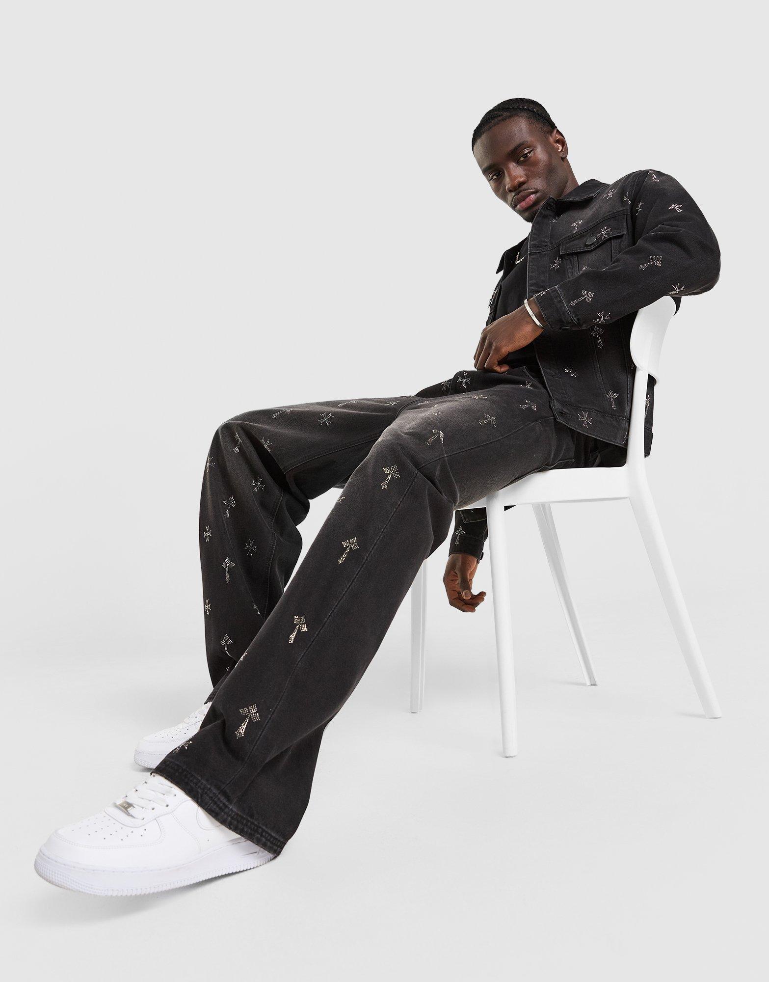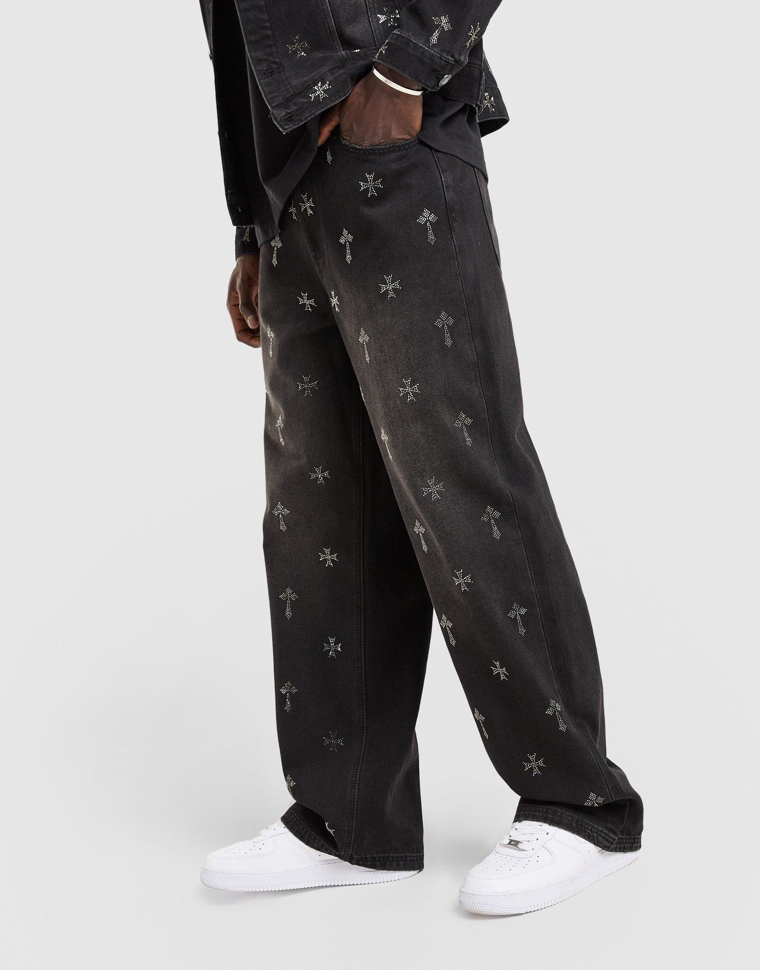 Spodnie Supply & Demand Break redefiniują klasyczny denim, wprowadzając do niego odważny, gotycki akcent. Głęboka czerń materiału stanowi idealne tło dla regularnie rozmieszczonego motywu krzyży, który nadaje całości unikalnego charakteru. To propozycja dla osób, które chcą wyróżnić się z tłumu i cenią sobie wyrazistą estetykę streetwearową.