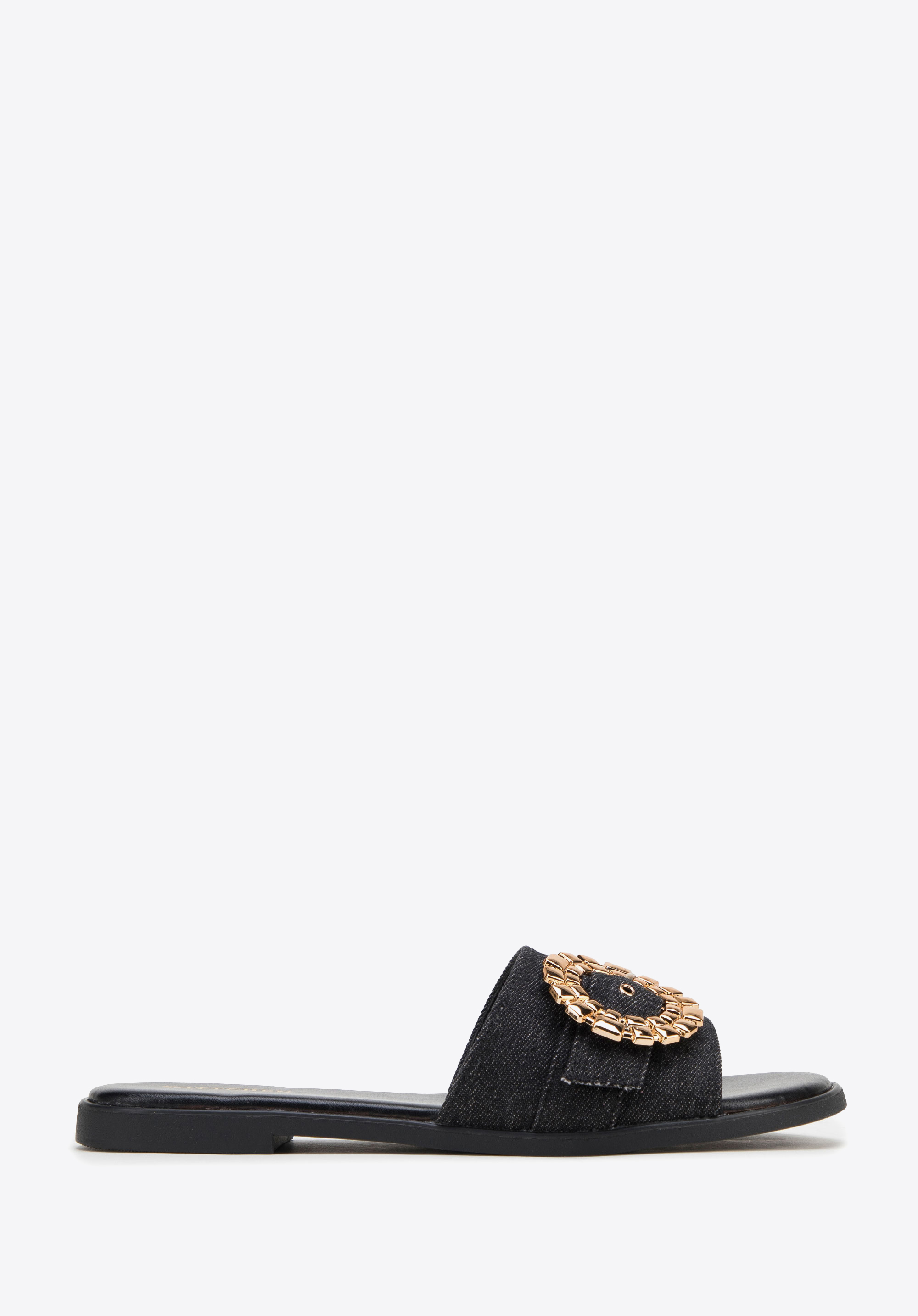 WITTCHEN Damskie klapki dżinsowe z błyszczącą klamrą czarne
