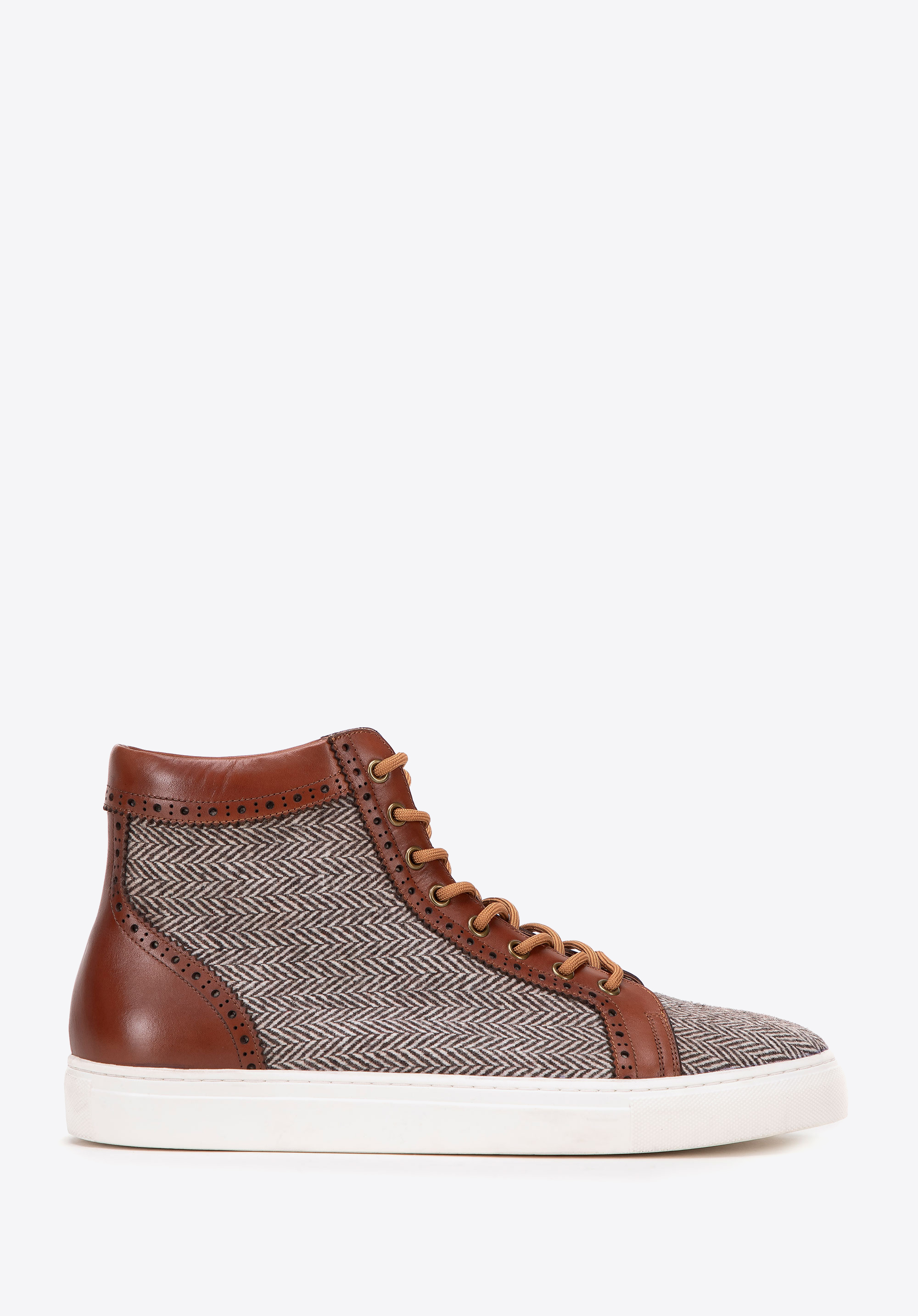 Te męskie sneakersy marki Wittchen to idealna propozycja dla mężczyzn ceniących wyrafinowany styl codzienny. Model ten harmonijnie łączy klasyczną elegancję z miejskim luzem, tworząc obuwie, które przyciąga wzrok unikalnym wzornictwem. Wysoka cholewka ozdobiona perforacjami w stylu brogue nadaje butom szlachetnego wyrazu, idealnie wpisując się w jesienne i wiosenne stylizacje.
