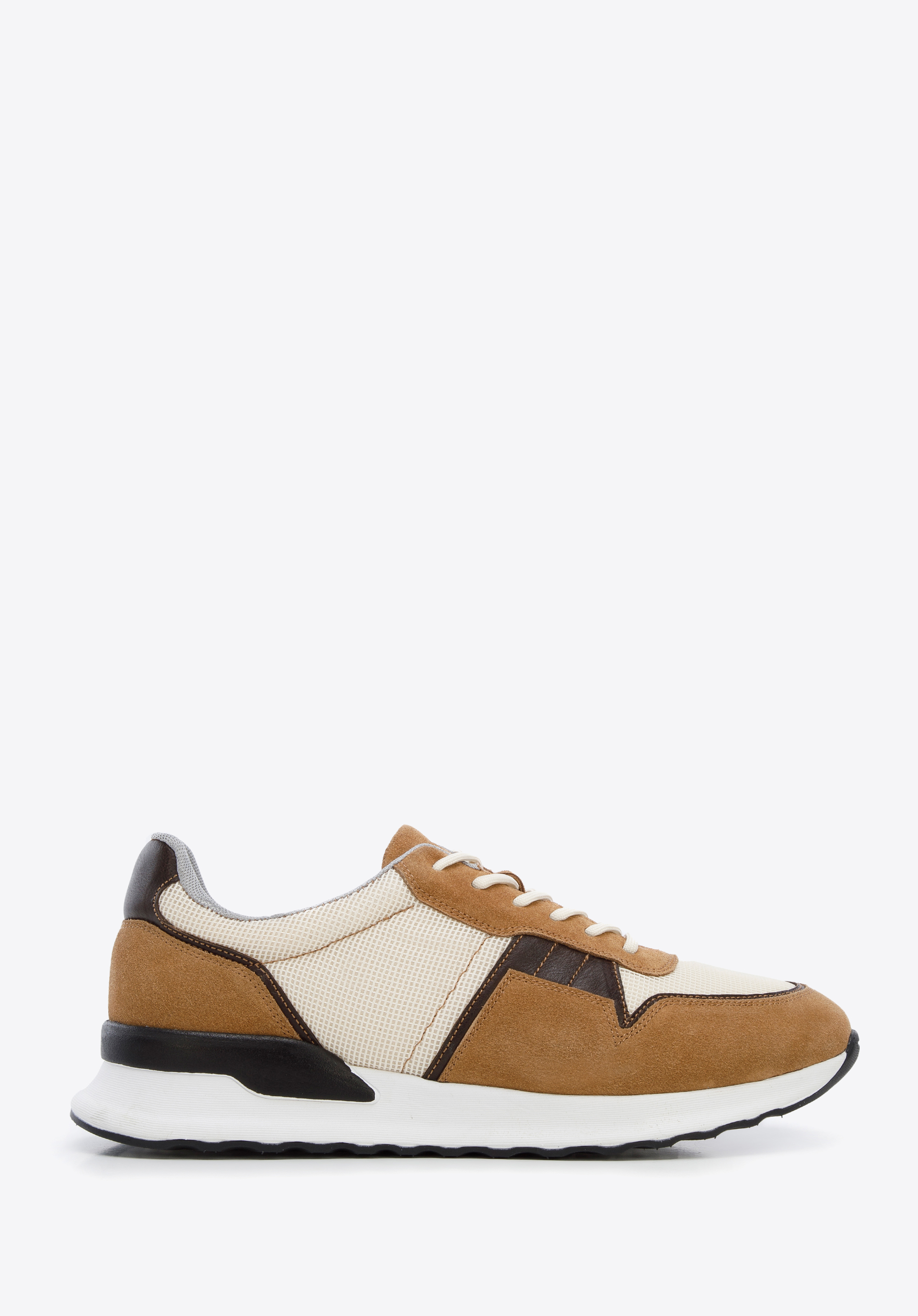 Męskie sneakersy Wittchen to wyrafinowana propozycja dla panów ceniących miejski szyk w swobodnym wydaniu. Harmonijne zestawienie odcieni brązu i beżu sprawia, że obuwie przyciąga wzrok, zachowując jednocześnie stonowany charakter. Są to buty idealne dla aktywnych mężczyzn, którzy potrzebują niezawodnego wsparcia podczas intensywnego dnia w pracy czy spacerów po mieście.