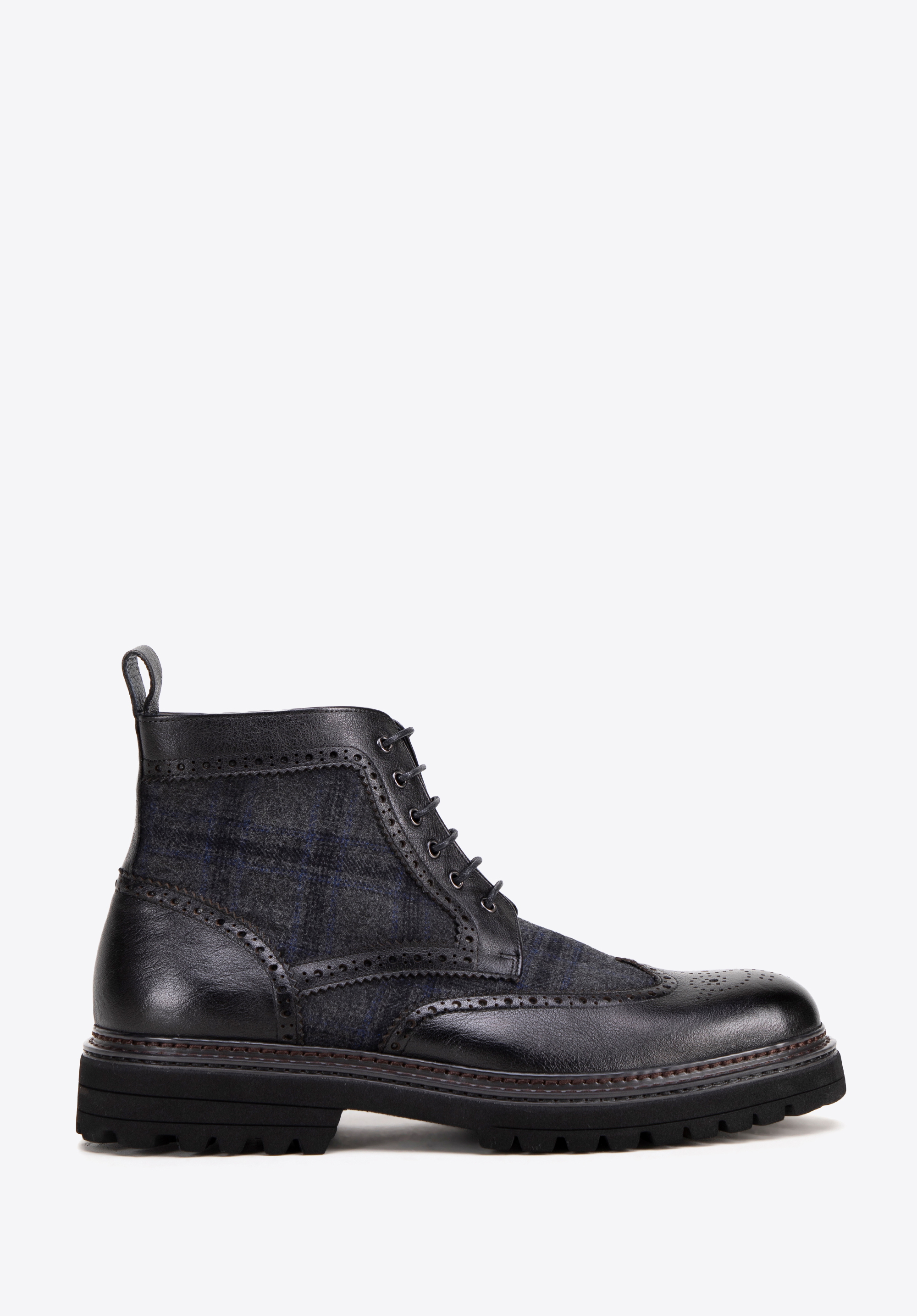 Męskie trzewiki Wittchen to unikalna propozycja dla panów, którzy nie boją się łączyć klasyki z odważnymi akcentami. Model ten wyróżnia się subtelnymi zdobieniami typu brogue oraz tekstylnymi wstawkami w modną kratę, co nadaje mu niepowtarzalnego charakteru. Czarne wykończenie sprawia, że buty są niezwykle uniwersalne, a ich solidna sylwetka dodaje pewności siebie w każdej sytuacji.