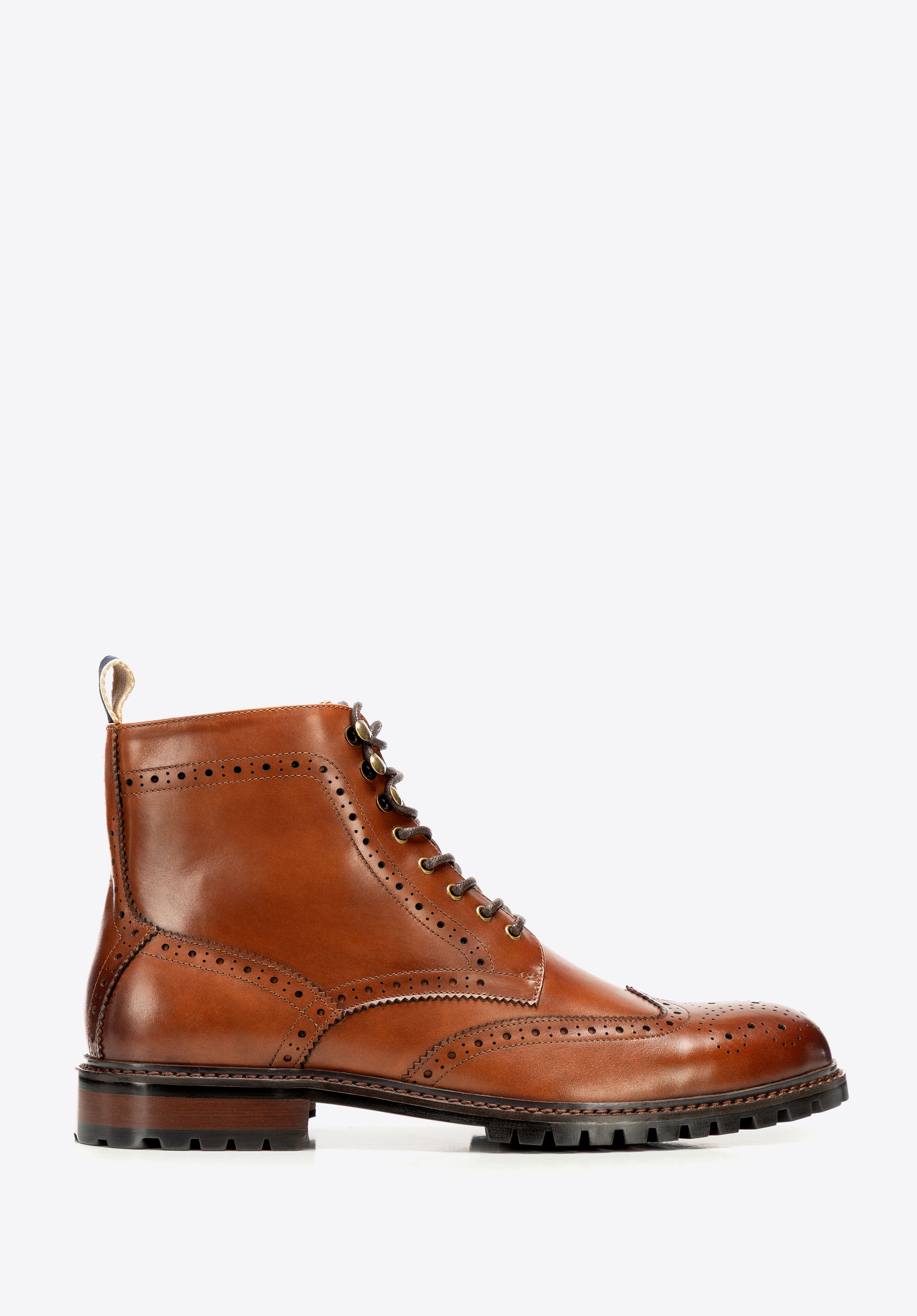 Eleganckie męskie trzewiki Wittchen wykonane z wysokiej jakości skóry naturalnej w kolorze jasnego brązu. Stylowe perforacje typu brogue oraz solidna podeszwa z wyraźnym bieżnikiem łączą klasykę z nowoczesną funkcjonalnością. Praktyczny boczny suwak ułatwia zakładanie, a sznurowanie zapewnia idealne dopasowanie do stopy w każdej sytuacji.