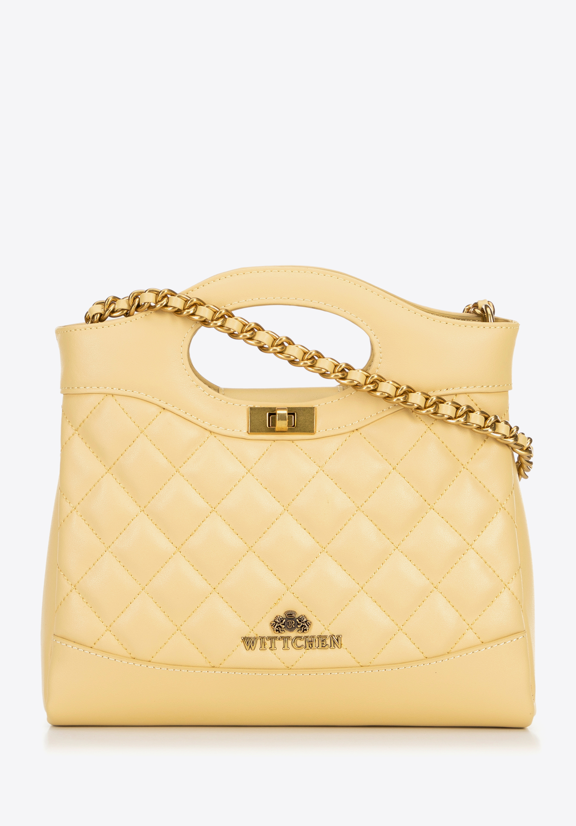 Elegancki minikuferek Wittchen wykonany z wysokiej jakości skóry naturalnej w delikatnym żółtym odcieniu. Pikowana faktura i złoty łańcuszek nadają mu luksusowego charakteru, idealnego na specjalne okazje. Sztywna konstrukcja sprawia, że torebka zawsze zachowuje swój nienaganny kształt.